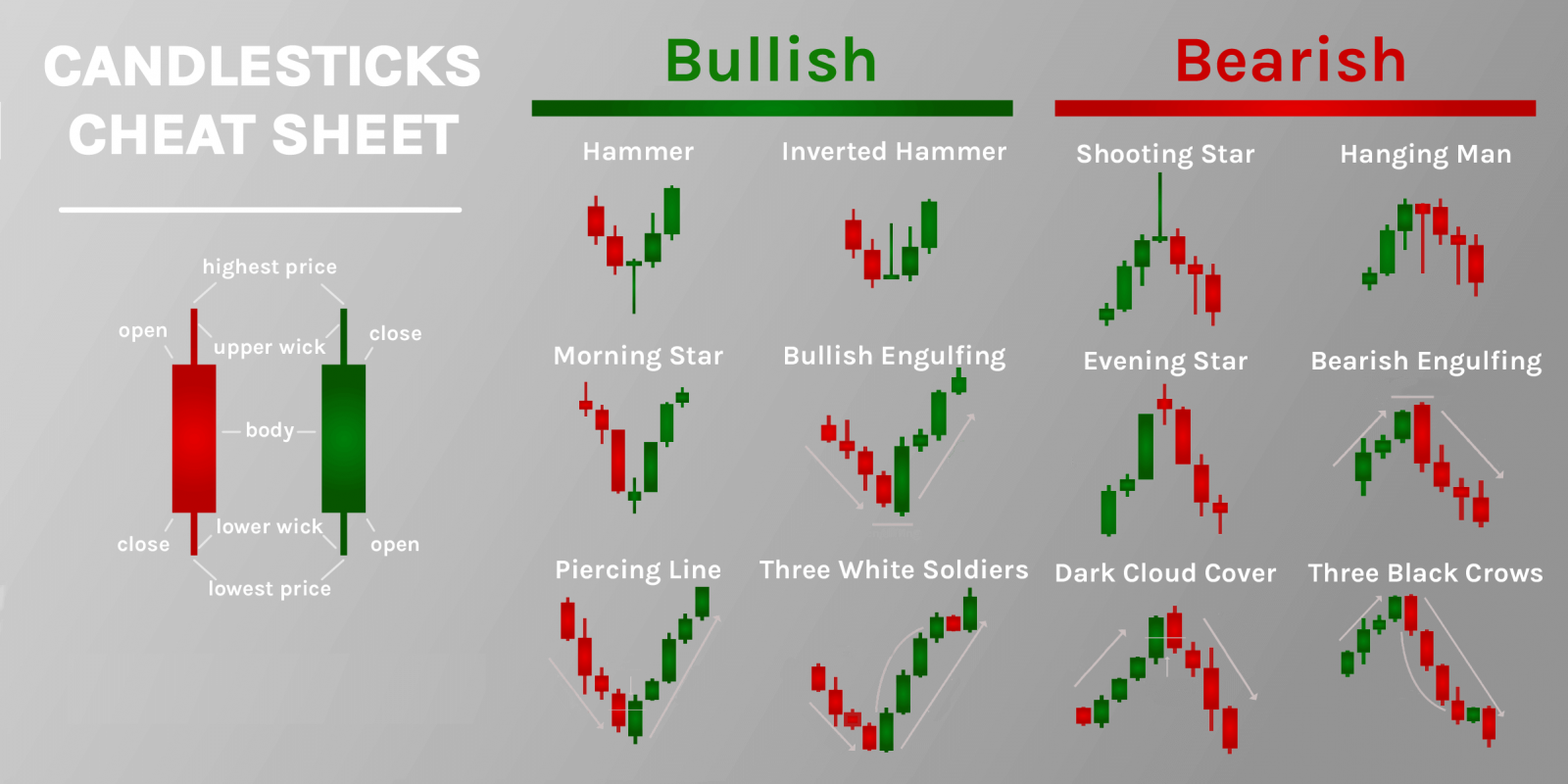 · Three Black Crows. It includes three black candlesticks, which follow a previous upward trend. It points to a reversal in the current market tendency, which is most likely caused by an influential bearish event. So, the downward trend will probably continue, which means one must open a short position. There is also an opposite pattern, which is called Three White Soldiers.
