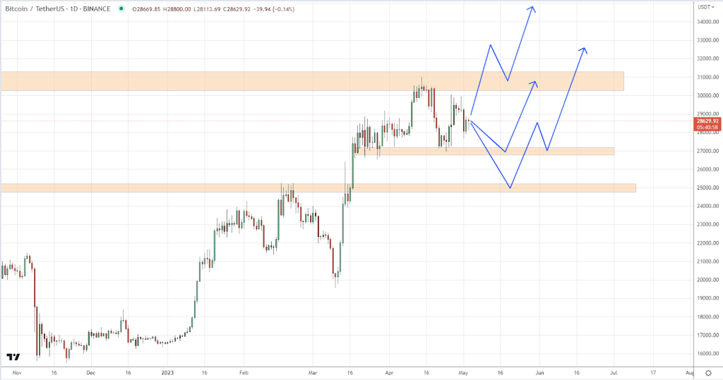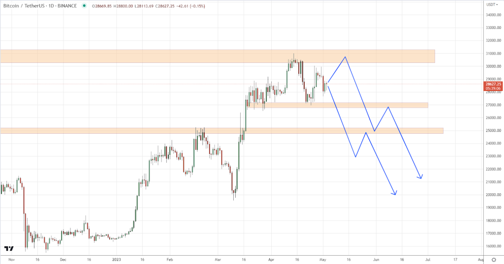 Bears, on the contrary, can allow testing $31,000 again and go for a breakdown of $25,000 – $27,000 with the potential for a further fall.