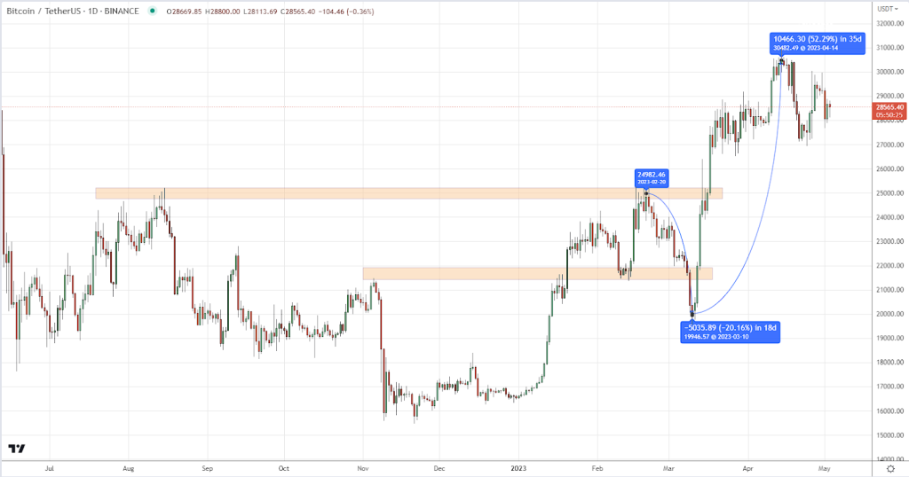 Obviously, the last jump in volumes occurred along with the price increase. And before that there was a drop from February 21 to March 10. It was on February 21 that the price tested the resistance of $25,000, which had been holding since August 2022. The bears responded aggressively, while the bulls did not insist. But they were cunning and hid like elves in the branches of trees. As soon as the last small players fell off, not expecting such impudence, the price sank even lower, to $20,000, as it seemed, below the support in the $22,000 area. But at that moment the bulls made their move and, gathering their strength into a fist, made a breakthrough. Behind was the resistance of $25,000…